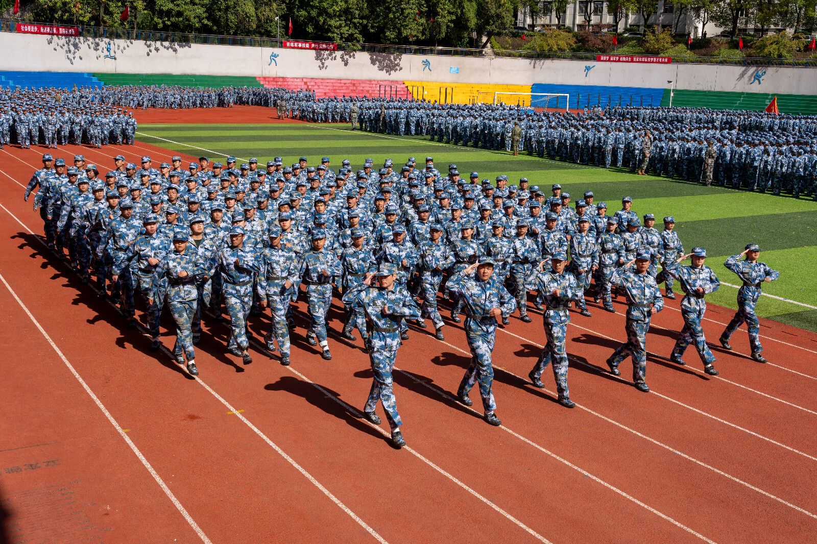 在军训成果展示中,由5000余新生组成的37个方阵,喊着嘹亮的口号依次通过主席台接受检阅。参训学生们依次展示擒敌拳、匕首操、防爆棍术等训练科目,他们一招一式刚劲有力,尽显蓬勃朝气,赢得在场师生的阵阵热烈掌声。