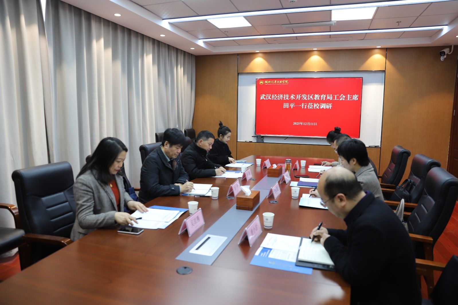 本网讯(文 张运/图 邓玉洁)12月11日下午,武汉经济技术开发区教育局工会主席田平率队莅临我校调研交流,学校党委常委、副校长张红霞出席活动。