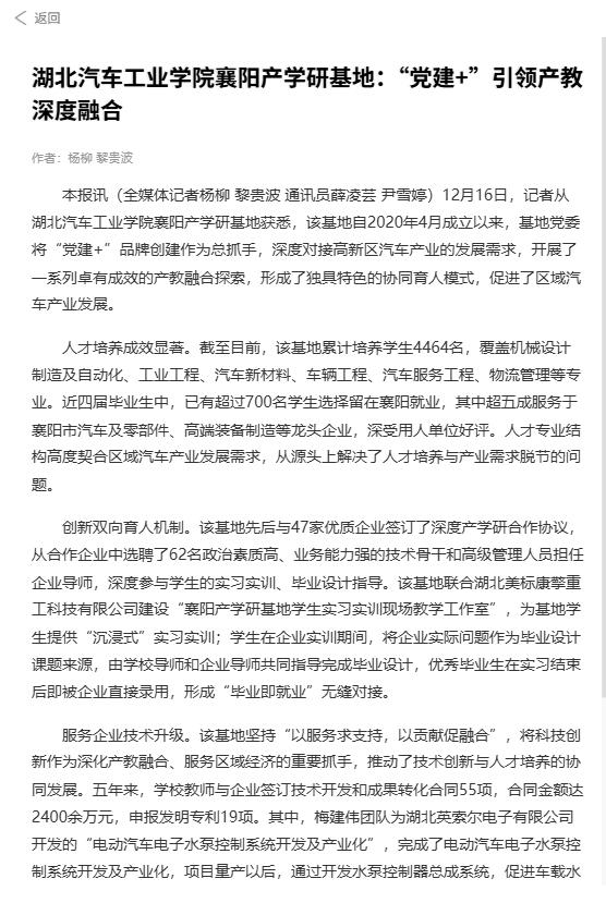 【襄阳日报】湖北汽车工业学院襄阳产学研基地:“党建+”引领产教深度融合