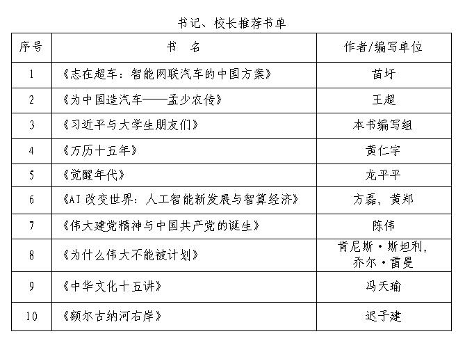 推荐书目既收录了《习近平与大学生朋友们》《伟大建党精神与中国共产党的诞生》等彰显时代精神、凝聚思想力量的红色经典,也精选了《志在超车:智能网联汽车的中国方案》《AI改变世界:人工智能新发展与智算经济》等聚焦科技发展、贴合时代需求的专业读物,同时纳入了《万历十五年》《中华文化十五讲》等坚定理想信念、厚植家国情怀、启迪历史智慧、提升人文素养的经典著作,引导广大师生在阅读中拓宽视野、启迪思想、涵养品格、增长才干。