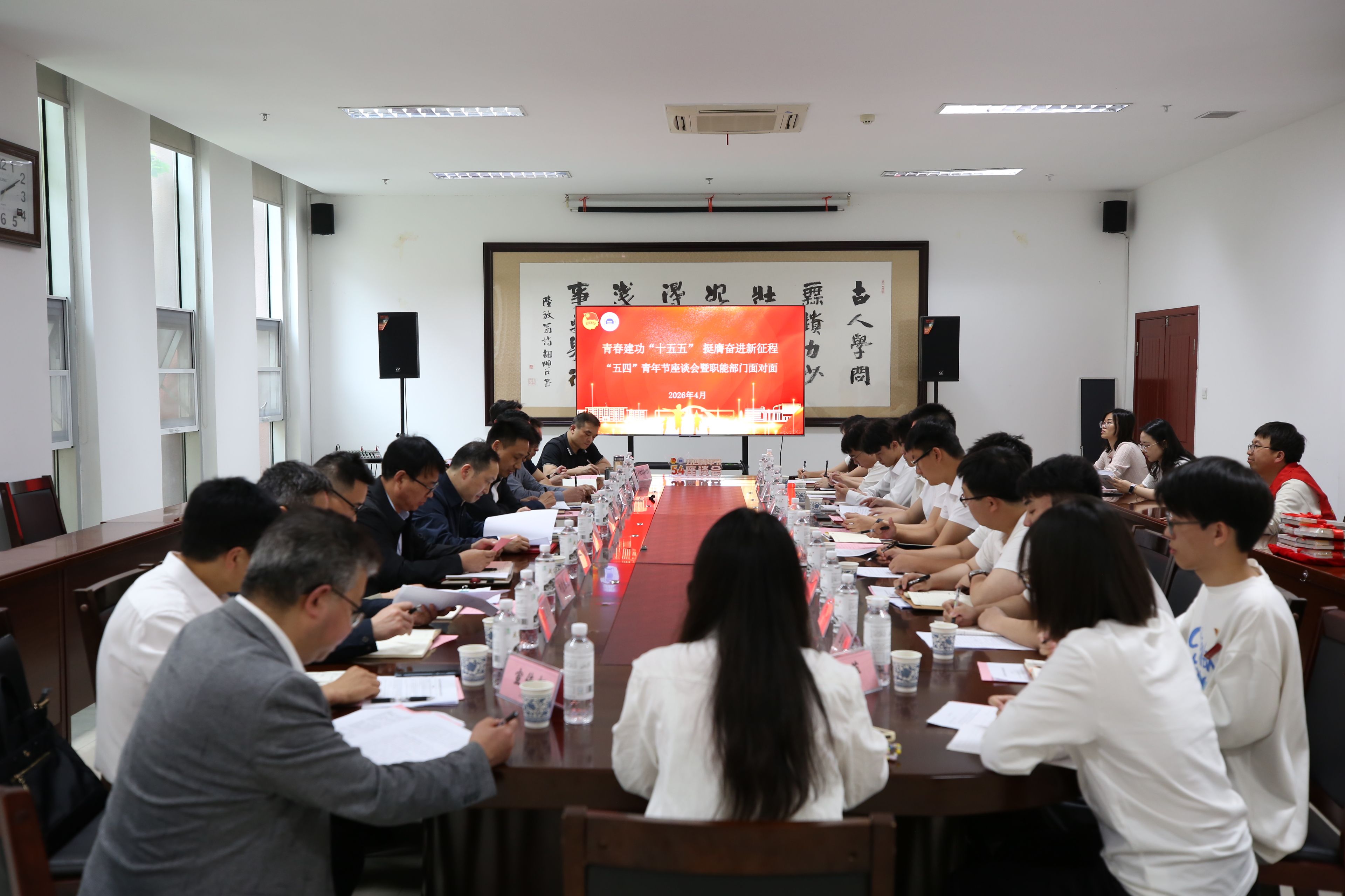 本网讯(文 鲍洁/图 李一凡、青年传媒中心)青春逢盛世,奋斗正当时。在五四青年节即将到来之际,4月27日,学校举行2026年五四青年节座谈会暨职能部门面对面活动。党委副书记、校长李涛出席活动并讲话,党委常委、副校长王文山主持活动,宣传部、学工部、教务处、科发院、研究生院、保卫处、建管处、资产经营公司、团委、双创学院相关负责人及13位青年师生代表参加。