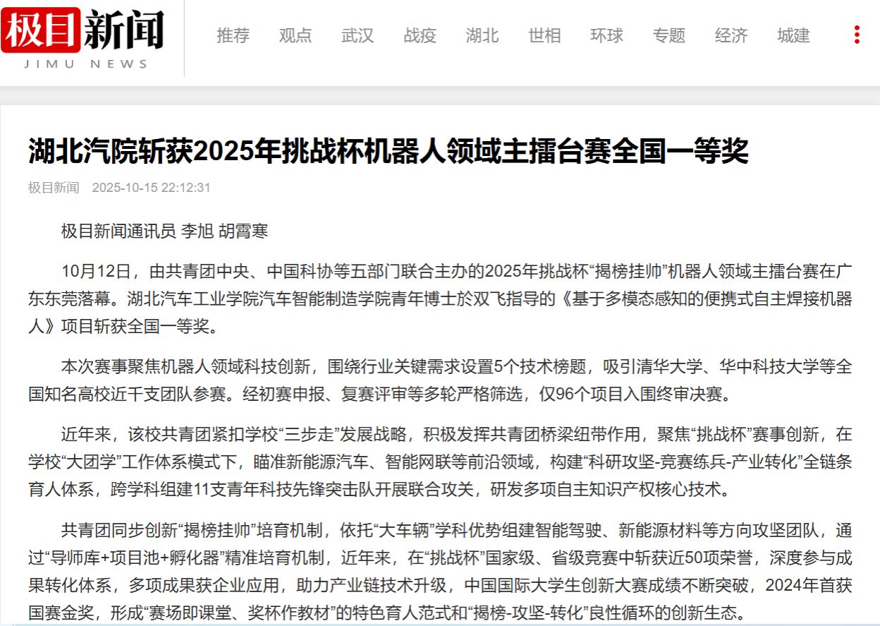 · | 【荆楚网】湖北汽院斩获2025年挑战... | 10-15 |