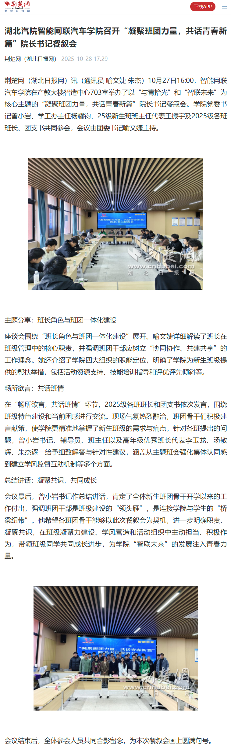 【荆楚网】​湖北汽院智能网联汽车学院召开“凝聚班团力量,共话青春新篇”院长书记餐叙会