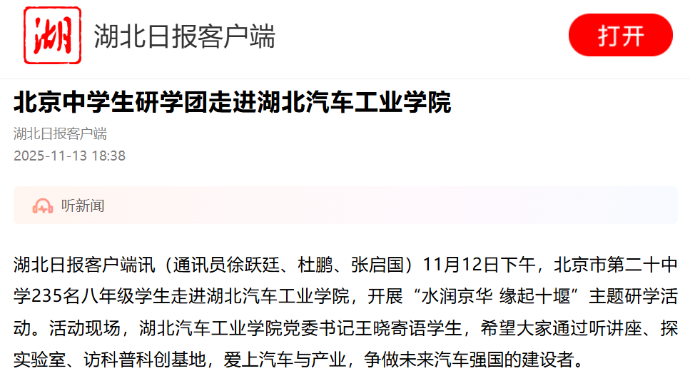 | · | 【湖北日报】北京中学生研学团走进... | 11-14 |