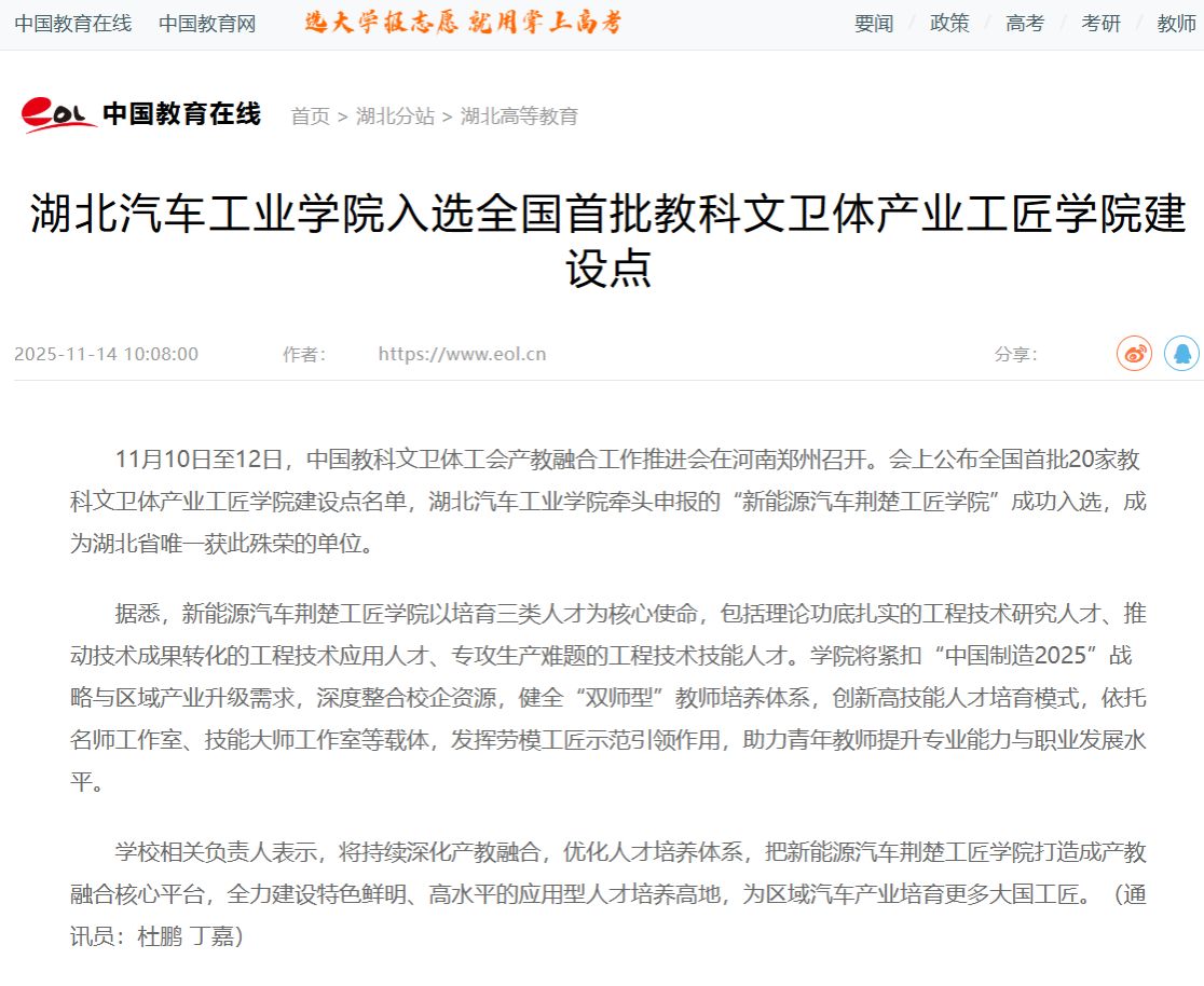【中国教育在线】湖北汽车工业学院入选全国首批教科文卫体产业工匠学院建设点