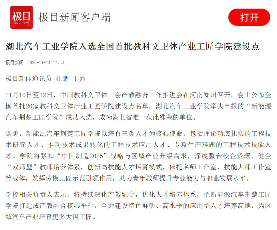 【极目新闻】湖北汽车工业学院入选全国首批教科文卫体产业工匠学院建设点