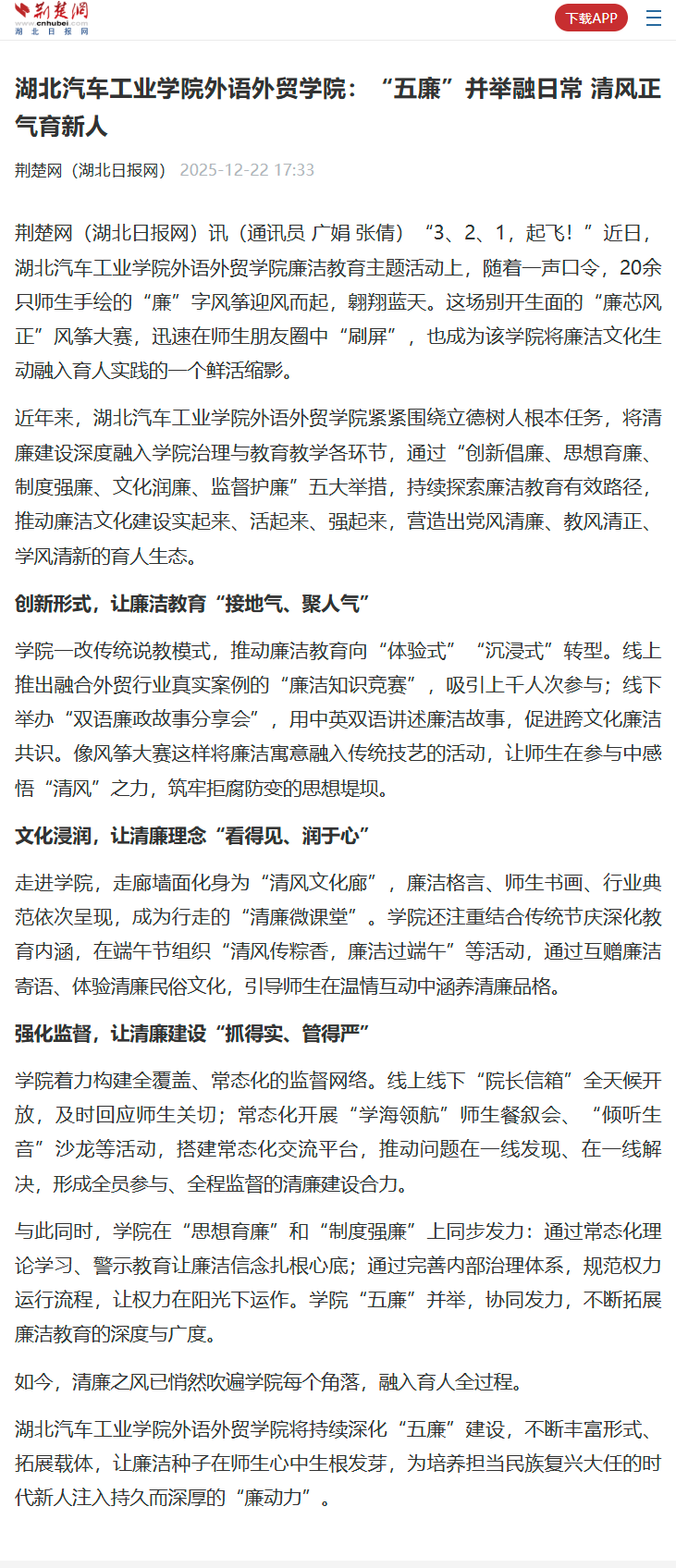 【荆楚网】湖北汽车工业学院外语外贸学院:“五廉”并举融日常 清风正气育新人