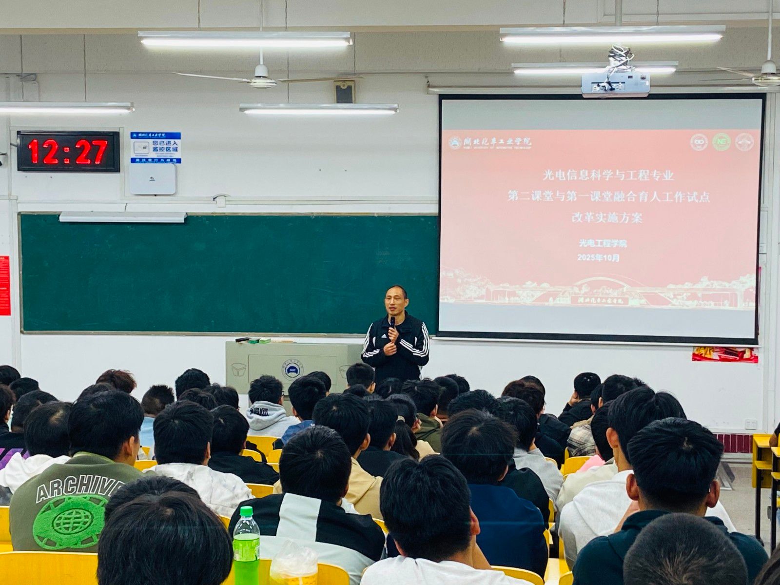 本网讯(文/李萌)为全面推进素质教育,深化人才培养模式改革,10月14日中午,光电工程学院在2101教室面向光电信息科学与工程专业2024级、2025级全体学生,举办了“第二课堂与第一课堂融合育人”试点改革实施方案专题宣讲会。此次宣讲旨在向同学们详细解读学院新推行的“第二课堂成绩单”制度及学分替代政策,引导学生主动规划学业与发展,提升综合竞争力。