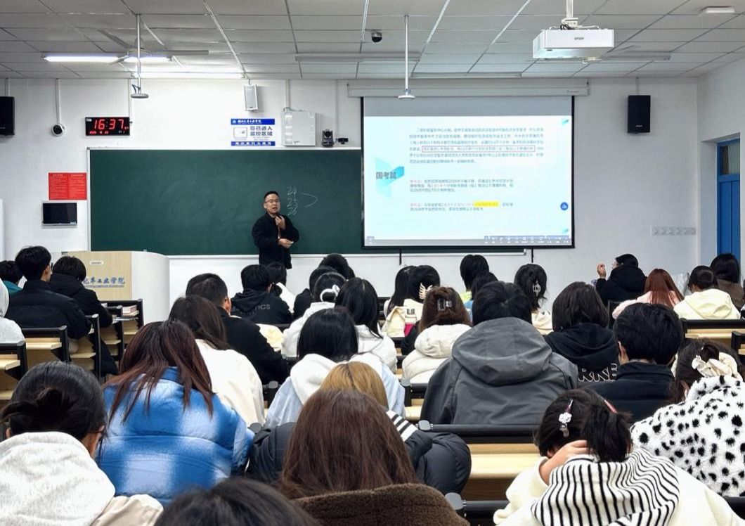 交流会上,李鑫武结合自身丰富的行业经验,从公职考试的报考条件、考试内容、备考方法等多个维度展开分享。他详细剖析了行测、申论等科目的命题规律与答题技巧,针对不同专业、不同备考阶段的学生提供了个性化的备考建议。同时,还结合湖北地区公职考试的考情特点,为同学们解读了岗位选择的策略,提醒大家要结合自身优势与职业规划,理性选择报考方向。