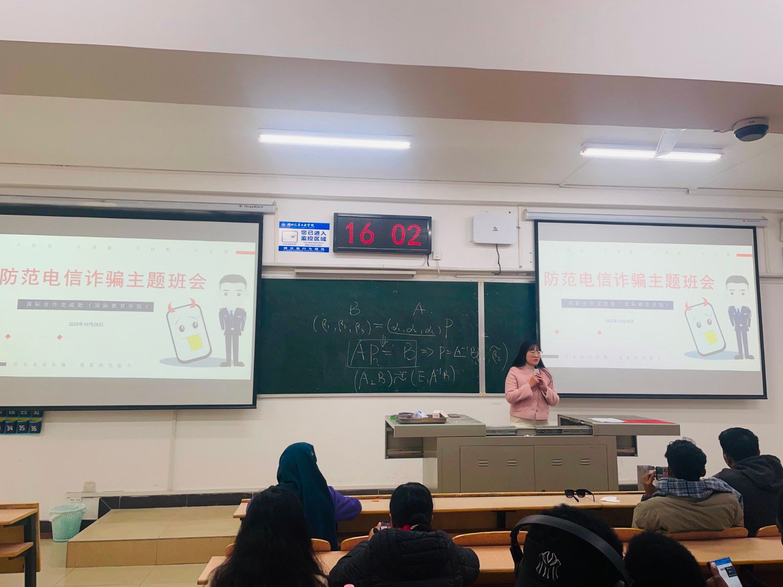 本网讯(文/图 张婷婷)为切实提升留学生群体防范电信网络诈骗的意识和能力,守护来华学习期间的财产安全,10月28日,国际教育学院组织全体留学生开展防范电信诈骗主题班会,通过案例剖析、互动问答、风险预警等形式,为全体留学生上了一堂生动的反电诈课程。
