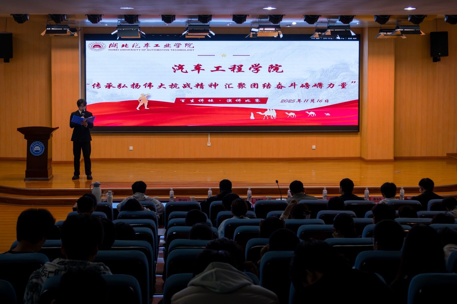 本网讯(文 张亮/图 王禹宸)11月16日下午,汽车工程学院“传承弘扬伟大抗战精神,汇聚团结奋斗磅礴力量”“百生讲坛”演讲比赛决赛在图书馆报告厅顺利举行。汽车工程学院辅导员刘光辉、陈超、迪力亚尔、往届优秀选手及25级参赛选手参加活动。