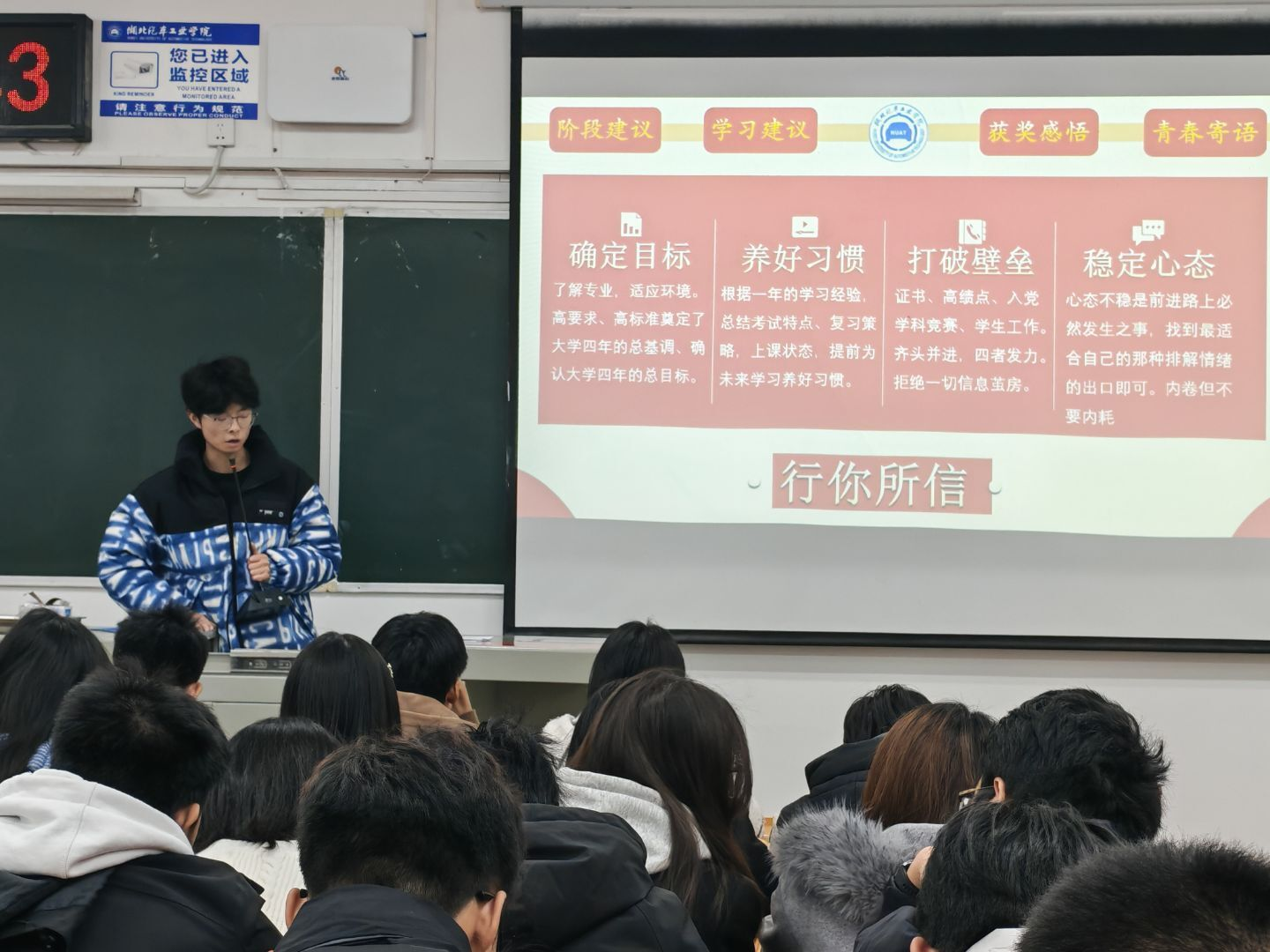 会上,多位国家奖学金及国家励志奖学金获得者依次上台,结合自身经历,从学业规划、学习方法、科研创新、社会实践与时间管理等多个维度,倾囊相授,分享了他们的成长心得与成功经验。国家奖学金获得者杨骐远同学重点介绍了高效学习方法和体系化阅读的技巧,强调厚积薄发的重要性;国家励志奖学金获得者万悦同学则结合自身经历,讲述了如何克服困难、科学规划学业,其励志故事赢得了阵阵掌声。