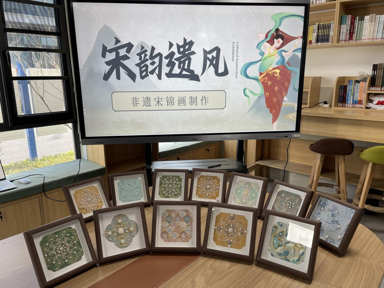 活动另一亮点为“非遗宋锦珍珠画”体验环节。宋锦因其源于宋代的产地与技艺而得名,质地坚柔、纹样典雅,素有中国“锦绣之冠”的美誉。孟甜向同学们展示了华美的宋锦面料,并讲解其“活色”工艺的独特之处。随后,同学们以宋锦为底、珍珠为墨,亲手将温润的珍珠点缀于画布之上,勾勒出青花瓷、传统纹样等图案,使丝绸的柔美与珍珠的光泽交相辉映。该环节不仅锻炼了审美与专注力,更让同学们深刻感受到传统工艺精益求精的工匠精神。