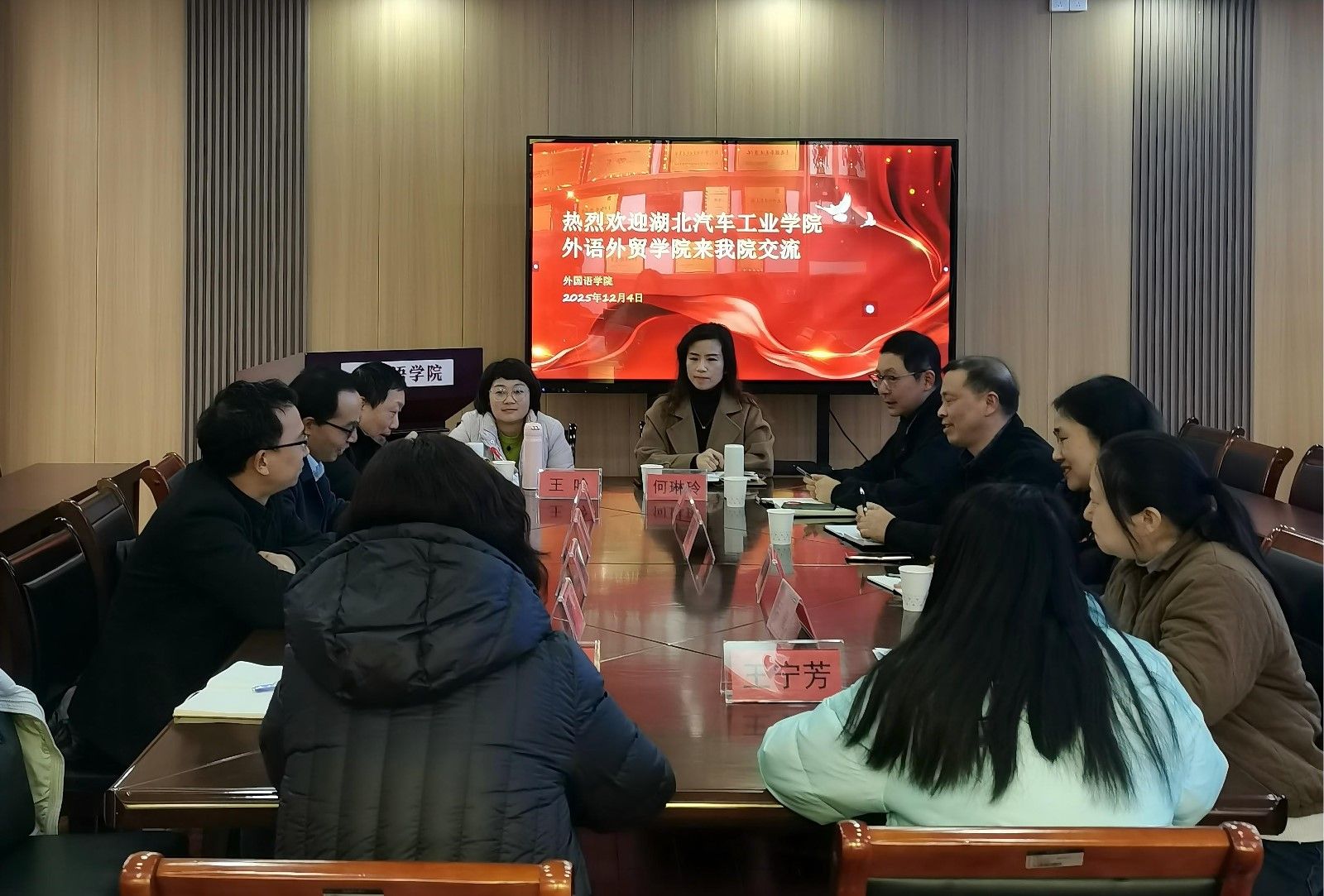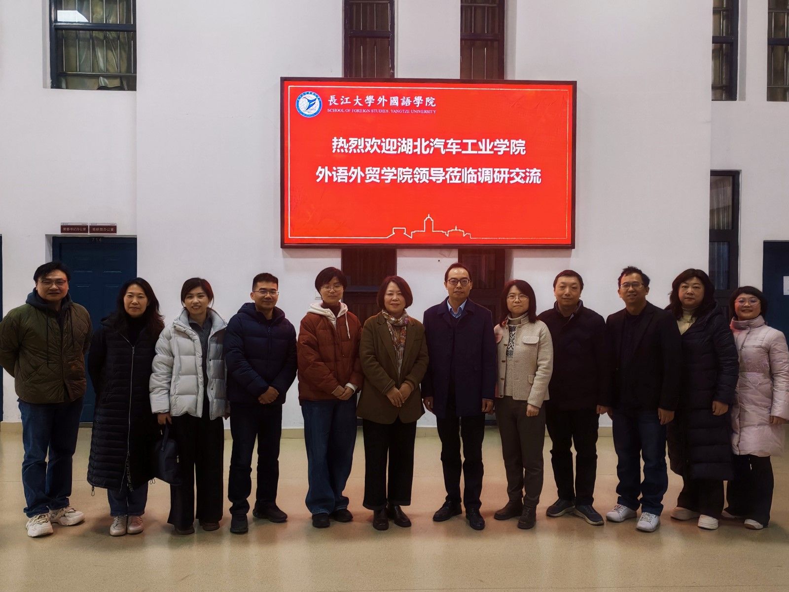 本网讯(文/章成成)为进一步推动学院学科建设和教学改革,做实做好2026版本科专业人才培养方案修订工作,外语外贸学院一行于12月3日至5日赴长江大学和荆楚理工学院开展调研交流活动。本次调研由学院院长杨荣广带队,副院长王辰晖、翟全伟、以及英语系、翻译系和公共外语教学部负责人一同参加了调研。