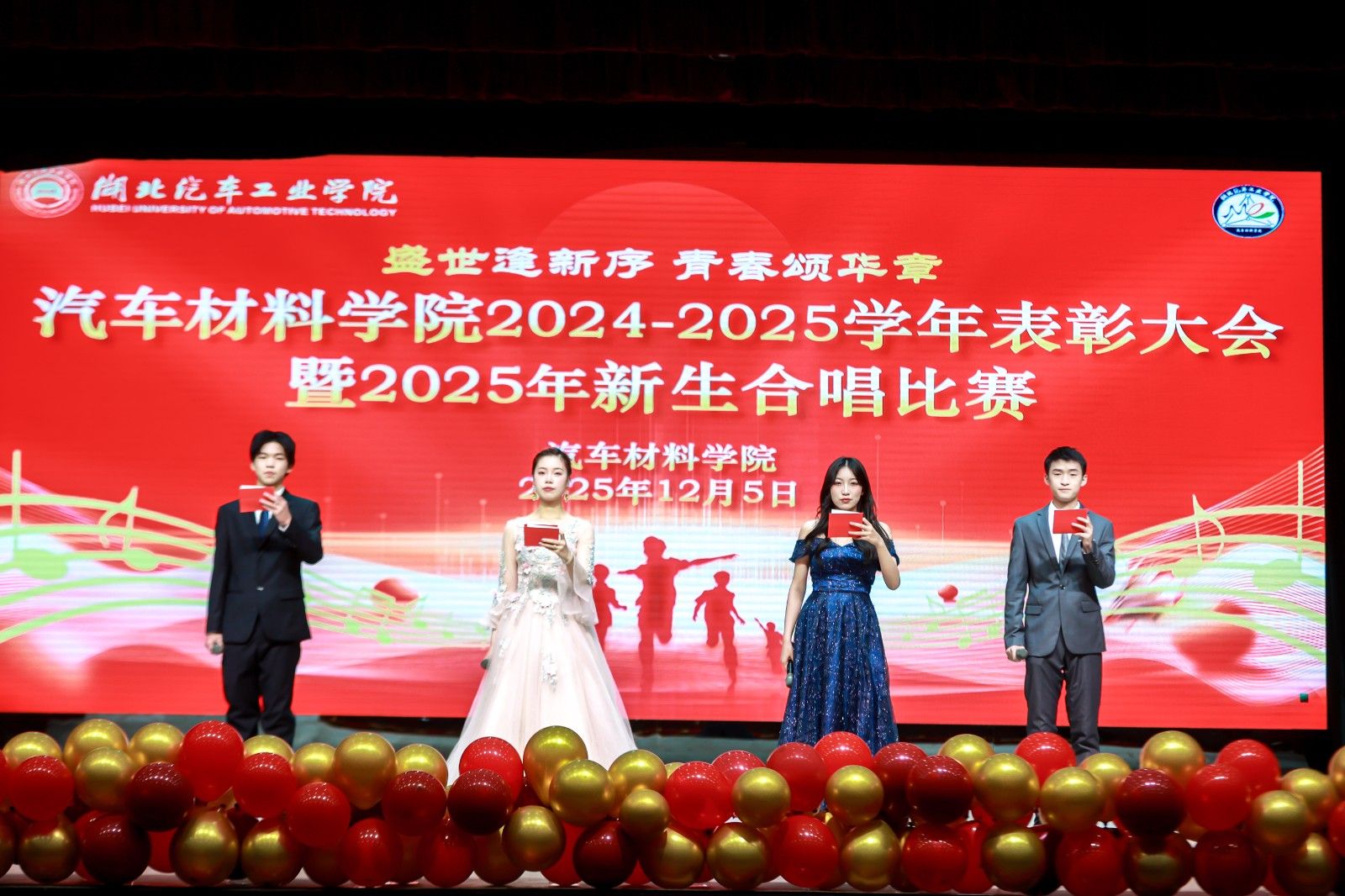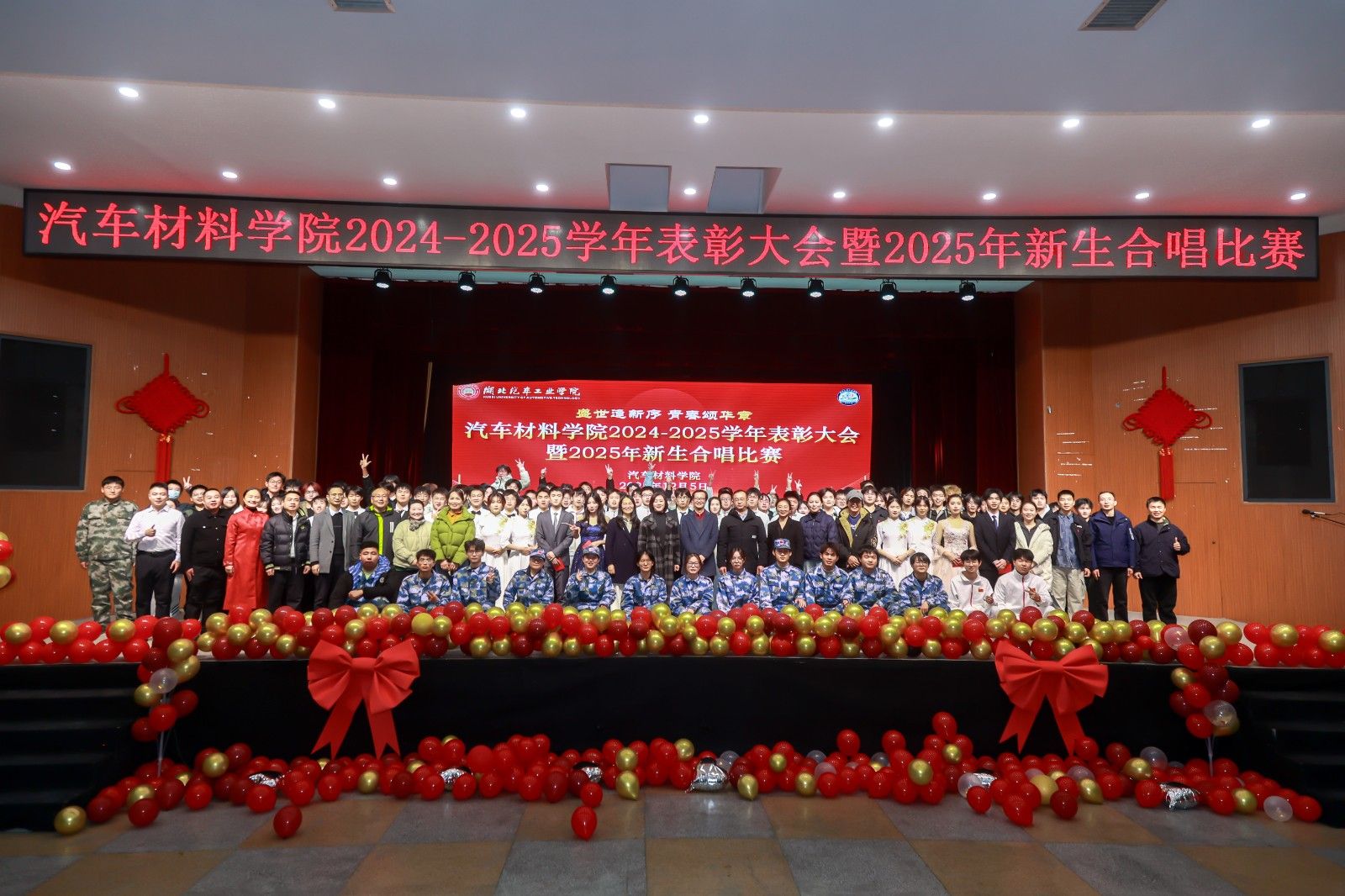 本网讯(文/图 骆无思)12月5日晚上,汽车材料学院“2024—2025学年表彰大会暨2025年新生合唱比赛”在校大礼堂举行。校学工部部长王关锋、校团委书记杜祥军、汽车材料学院党委书记杨陵郧、学工部副部长杜昕俊、研究生院党委副书记肖越、离退休工作处副处长黄凯、副院长刘峰、副书记何君、汽车材料学院全体辅导员、新生班班主任老师参加活动,领导嘉宾与全体师生齐聚一堂,以表彰树榜样,用歌声颂家国,共赴青春盛会。