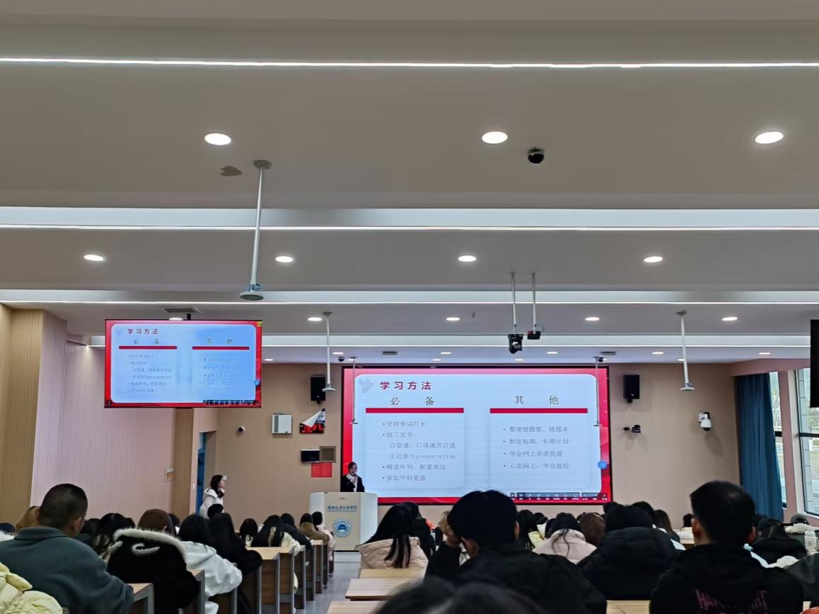 会上,获奖学生结合自身专业特色与求学经历,围绕学习经验技巧、相关竞赛实战策略、大学四年规划逻辑等方面带来针对性满满的干货。翻译231彭可分享翻译练习技巧与译文优化技巧,拆解翻译能力进阶路径;英语224胡恩琦梳理专四备考规划与高效学习方法,分享学科竞赛备赛经验与时间管理技巧;国贸222丁凤灵解读职业方向探索思路与实践资源对接方法,强调“持续积累”与“明确目标”的重要性。(审稿 张倩)