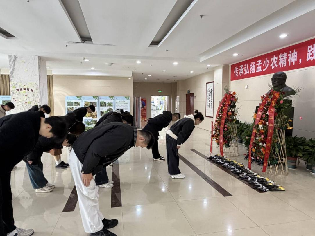 在孟少农先生铜像前,师生代表整齐列队,新进党员首先集体鞠躬并默哀一分钟,表达深切缅怀。随后,依次上前,恭敬献上手中鲜花,白菊朵朵,寄托对孟少农先生的崇高敬意与无尽追思。