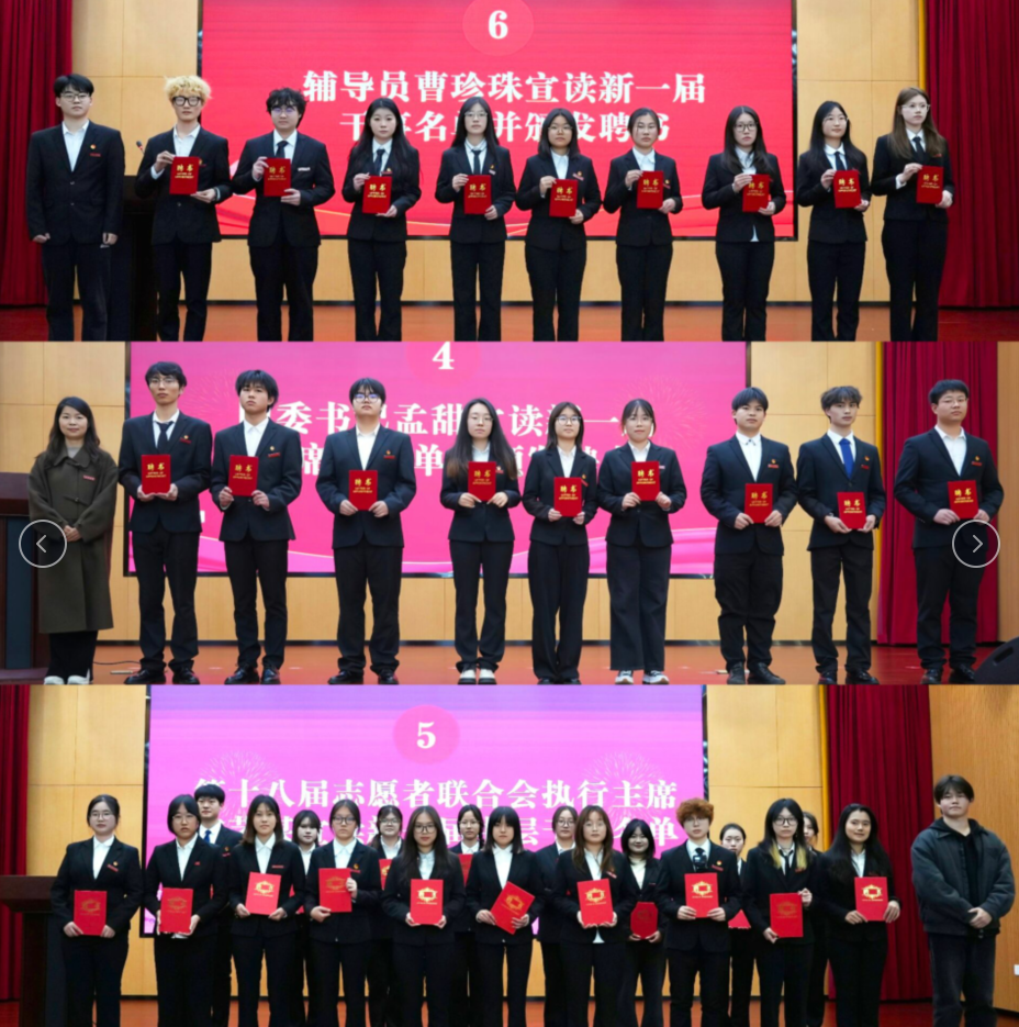 随后举行聘任仪式。学院团委书记孟甜宣读第二十届学生会主席团名单,学工办主任魏院珍宣读新一届中层干部名单,辅导员曹珍珠宣读新一届干事代表名单。与会老师分别为新任学生干部颁发聘书。一纸聘书,承载着学院的信任与嘱托,也象征着责任与使命的正式传递。