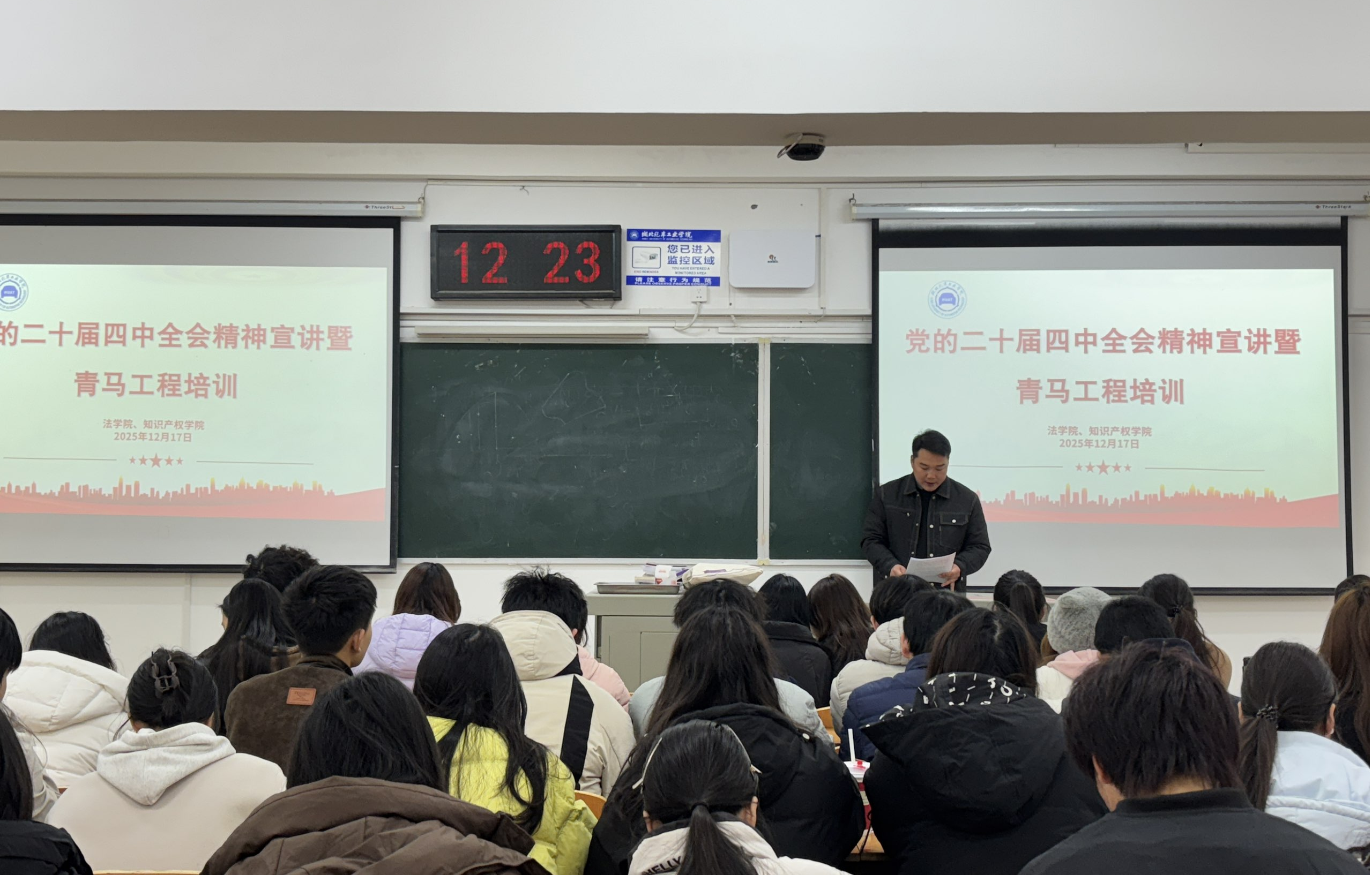 本网讯(文/图 杜伦、许佳诺、张沂茗)为深入学习贯彻党的二十届四中全会精神,切实加强青年学生思想引领,提升学生骨干政治素养与责任担当,12月17日,法学院、知识产权学院开展党的二十届四中全会精神宣讲暨“青马工程”培训活动。学院团委副书记杜伦、全院团支书、青马班学员及2025年秋季新发展团员代表参加活动。