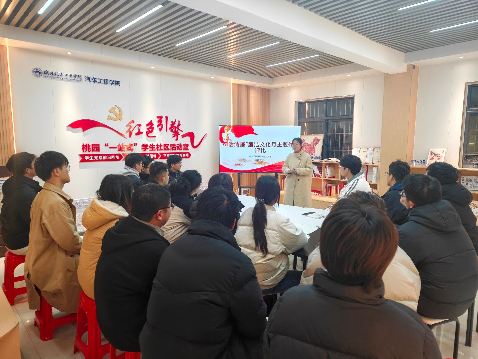 12月16日,汽车工程学院在桃园“红色引擎”一站社区学生活动室内,60余名学生党员们齐聚屏幕前,展示并解读自己利用数字技术创作的廉洁文化作品。