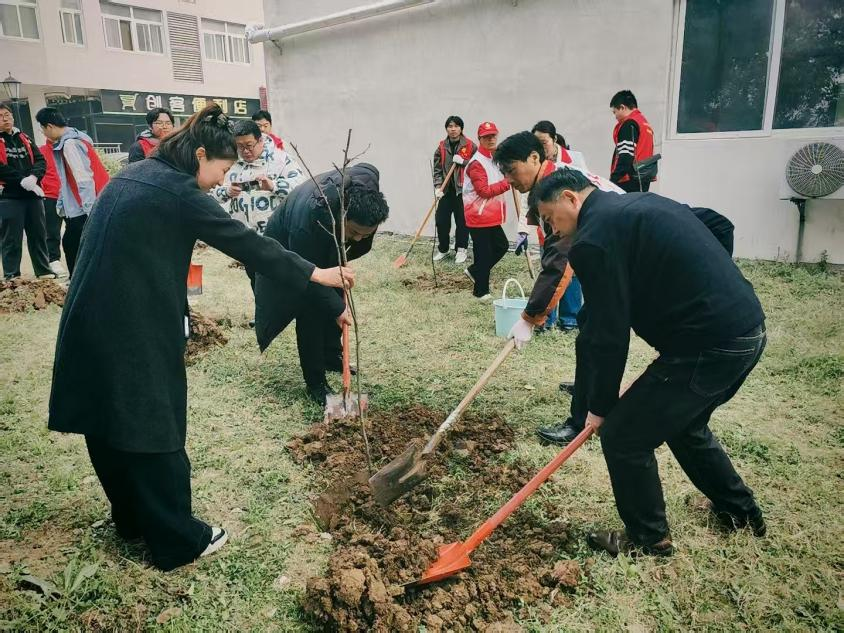 活动现场,大家手持铁锹、水桶等工具,扶苗、培土、浇水,现场呈现出一派热火朝天的劳动景象。在同学们和社区志愿者的共同努力下,一株株新栽种的树苗迎风挺立,为初春的大地增添了勃勃生机。