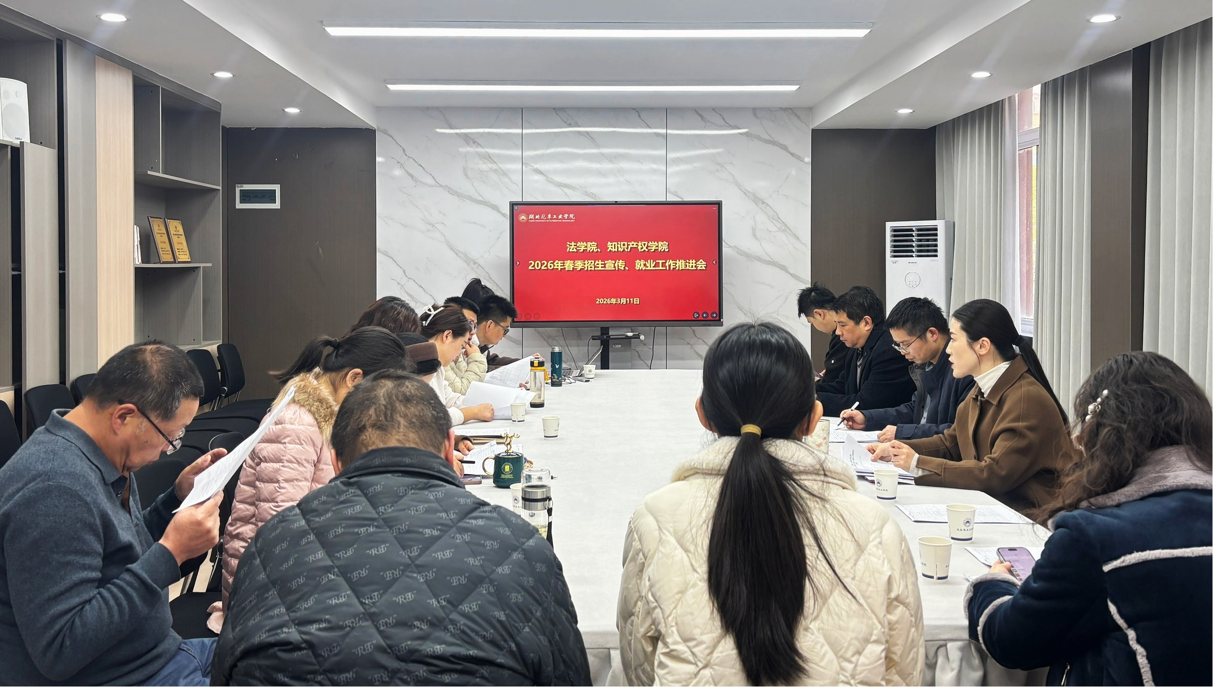 本网讯(文/图 郭慧、张沂茗)为扎实推进2026年招生宣传与毕业生就业工作,3月11日,法学院、知识产权学院在三教3206会议室召开春季招生宣传、就业工作推进会。学院党委书记计毅波、院长黄永昌及全体班子成员,学工办、各系主任、专业负责人及毕业班班主任、毕业设计指导教师参会,会议由学院党委副书记李童主持。