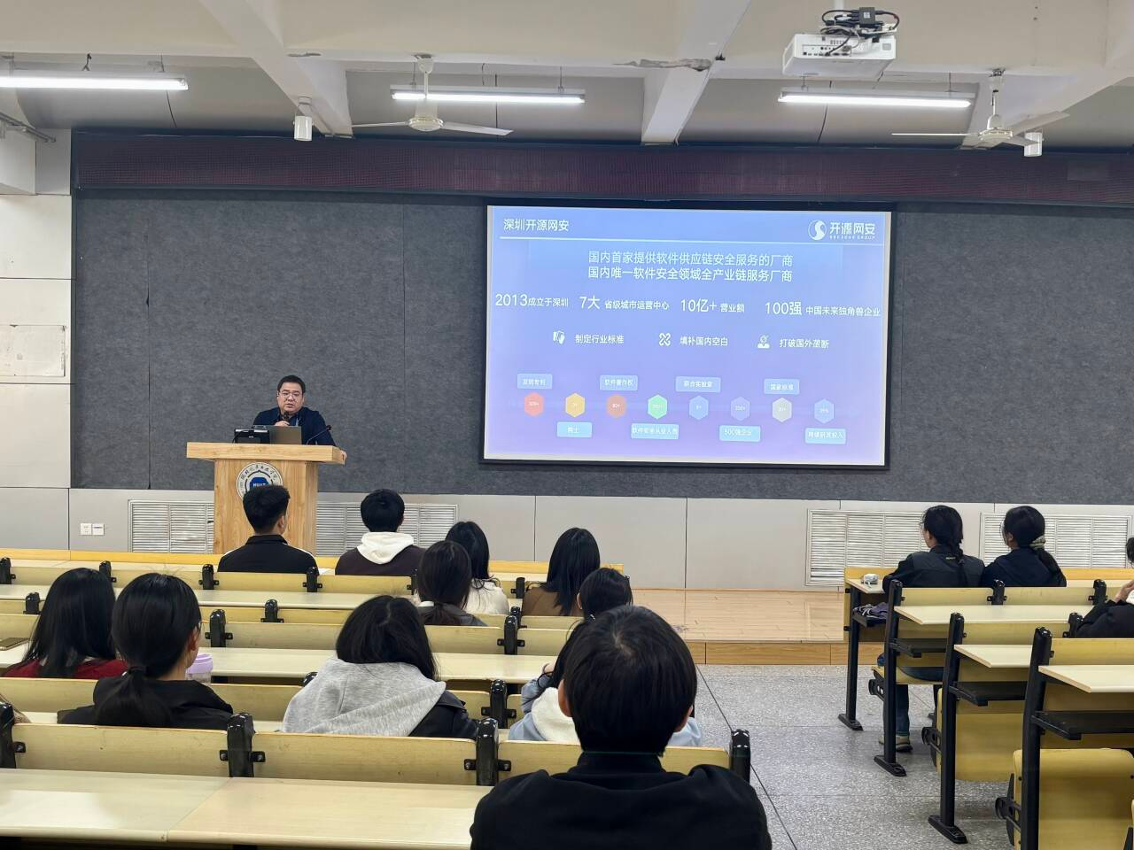 本网讯(文/图 缪学笛)为搭建校企协同育人平台,帮助学生对接职场、明晰职业方向,3月27日,智能网联汽车学院特邀开源网安公司在6113教室开展实习招聘宣讲会。本次宣讲会由吕成志博士主持,学院党委书记曾小岩出席并讲话,公司销售总监袁晨主讲,我院大三、大四学生踊跃参与。
