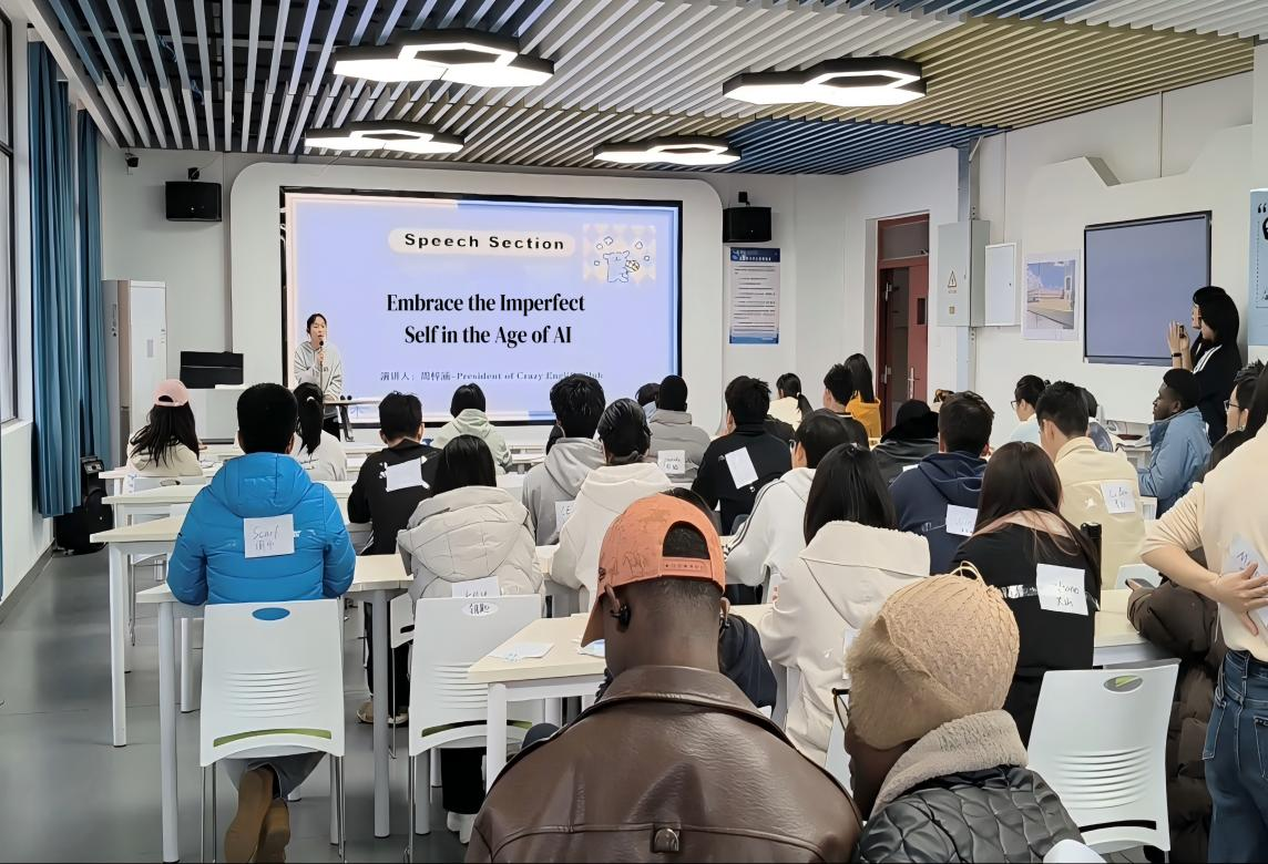 随后的分享环节直击思想深处。俱乐部会长周梓涵发表题为《Embrace the Imperfect Self in the Age of AI》的演讲,指出在算法追求极致精准的时代,人类更应坚守情感的独特温度与批判性思维,这才是不可替代的核心价值。