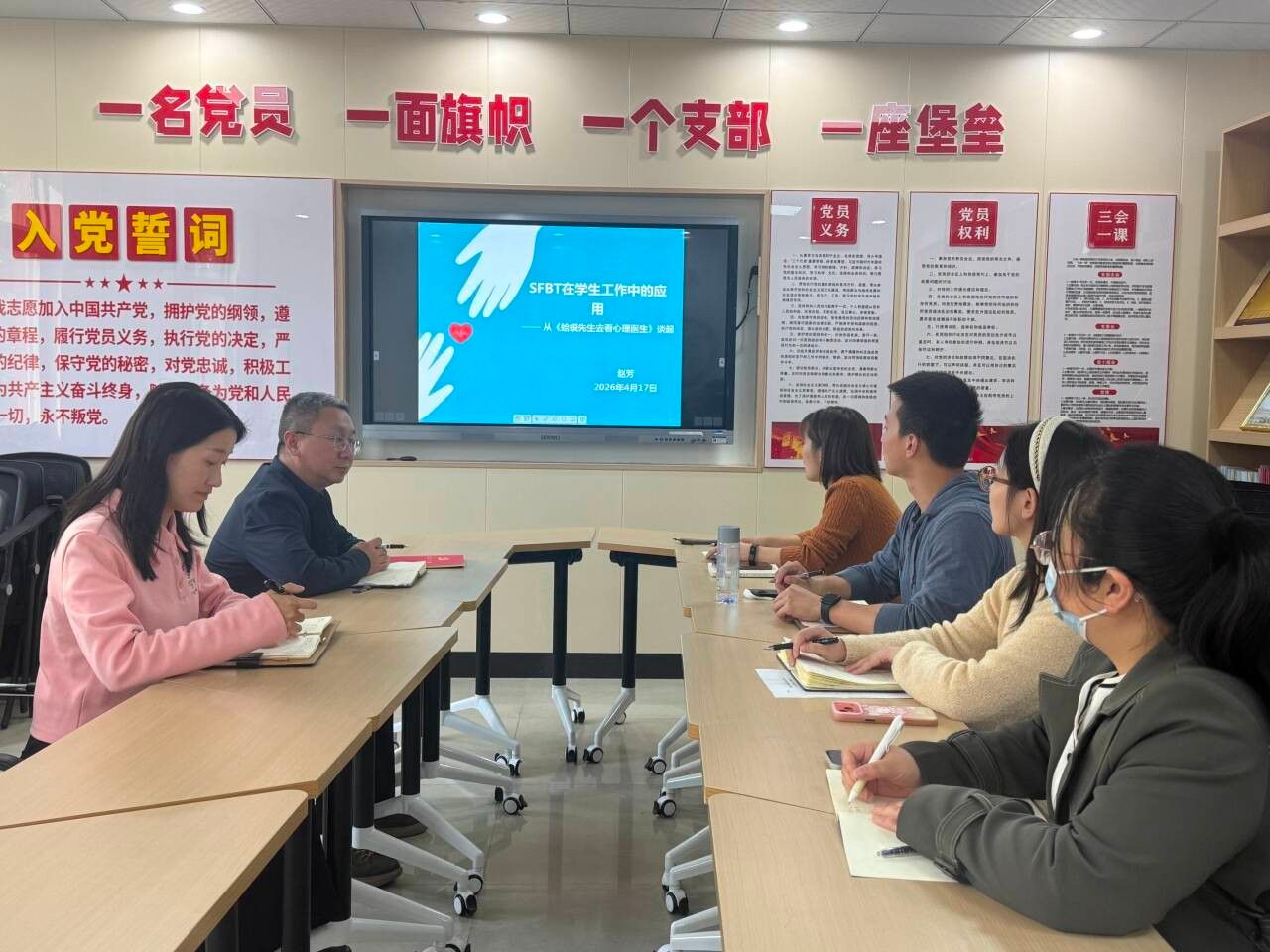 本网讯(文 赵芳/图 高梓洵)4月17日下午,汽车智能制造学院“头雁领航”辅导员工作室举办第五期辅导员理论学习活动。本次活动以“SFBT在学生工作中的应用——从《蛤蟆先生去看心理医生》谈起”为主题,聚焦提升辅导员谈心谈话专业能力,推动学生工作提质增效。学院党委副书记马晓涛、学工办全体辅导员及班主任参加学习。
